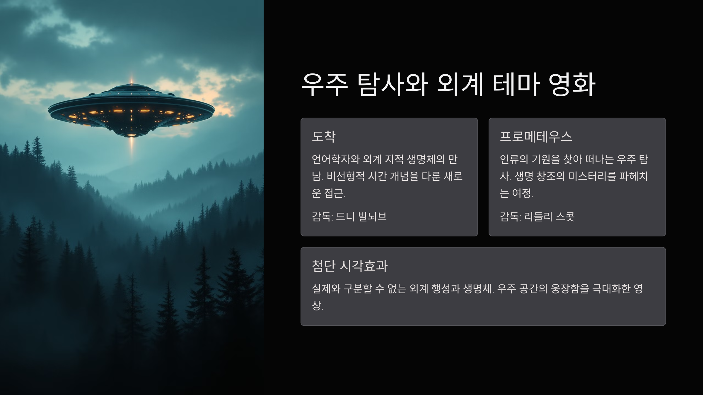다음 섹션에서는 우주 탐사와 외계 생명체를 주제로 한 영화들을 소개할게요! 지구를 벗어난 상상력, 함께 떠나볼까요? 🌌