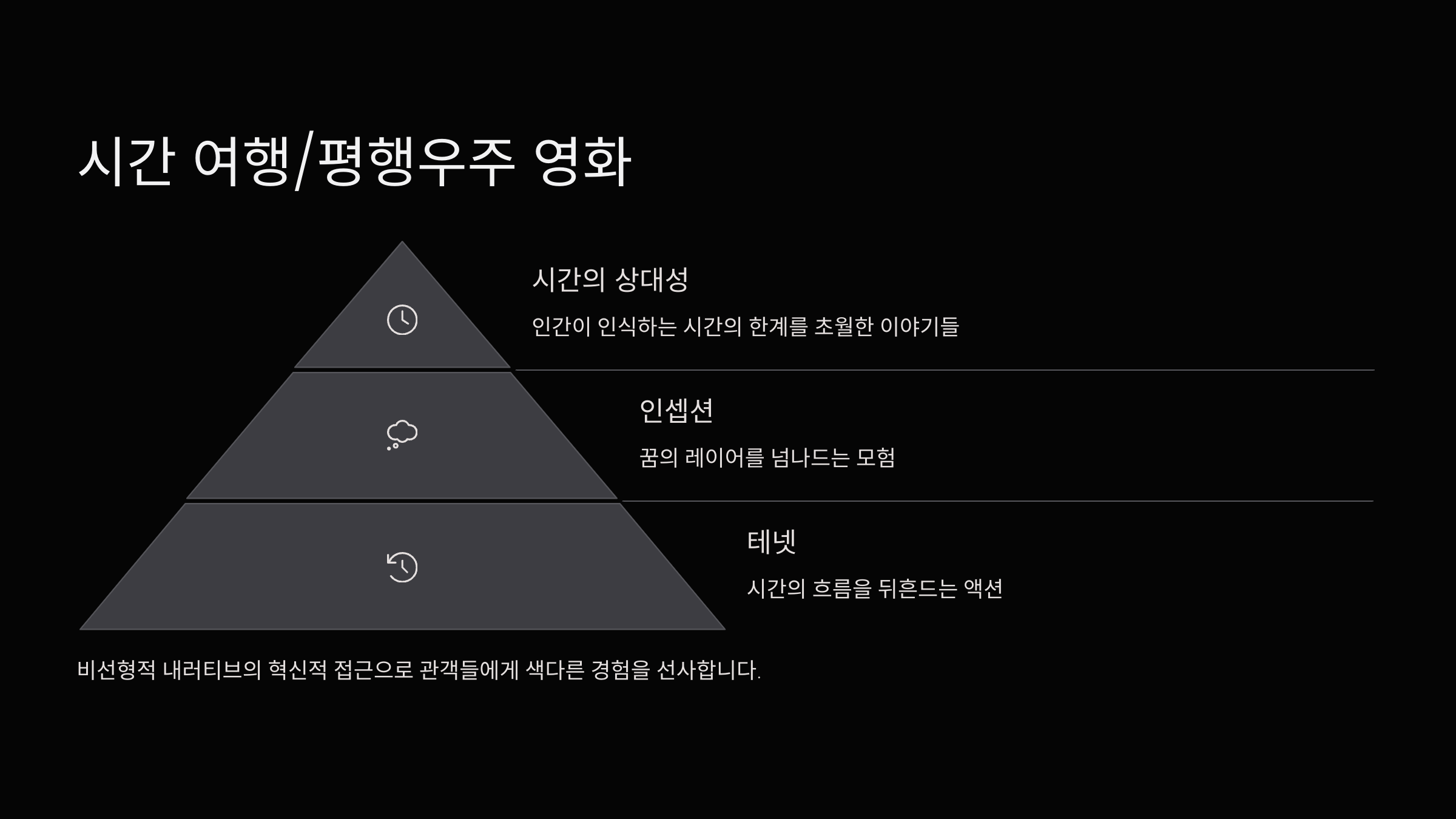 | 테넷 | 시간 역행 | 복잡한 서사, 액션 중심 |