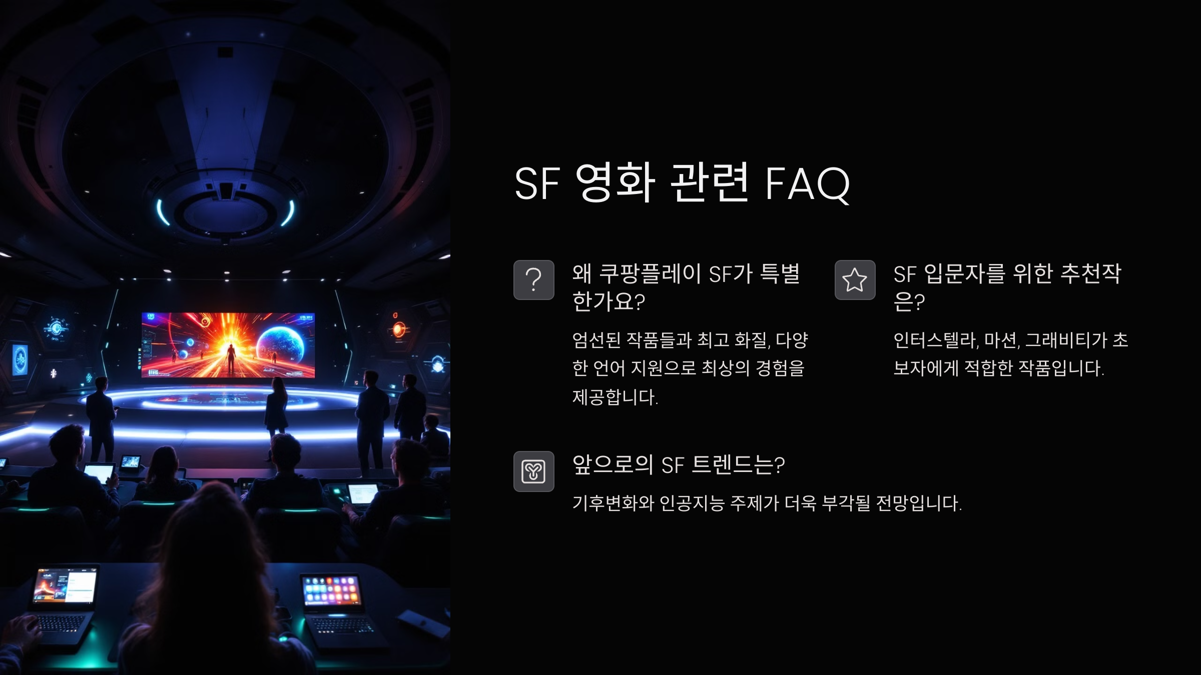 이제 쿠팡플레이에서 SF 영화들을 볼 때 어떤 작품을 선택해야 할지 훨씬 쉬워졌죠? 🎥 다음은 가장 많이 궁금해하는 SF 영화 관련 질문들을 모은 FAQ 시간이에요!