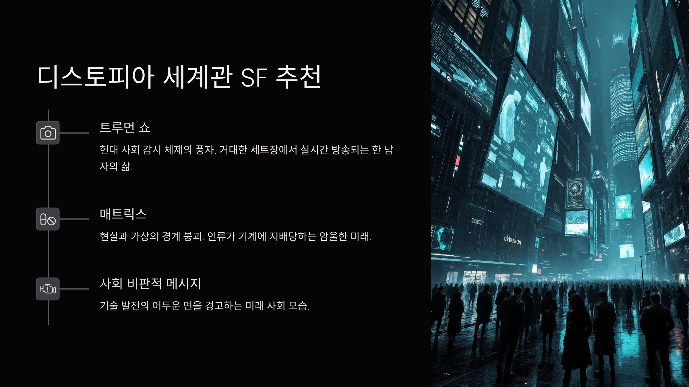 그래서 디스토피아는 그냥 어두운 이야기만이 아니라, 일종의 경고처럼 느껴져요. 지금 우리가 무엇을 바꾸고 준비해야 하는지에 대한 힌트를 주는 장르 같기도 해요.