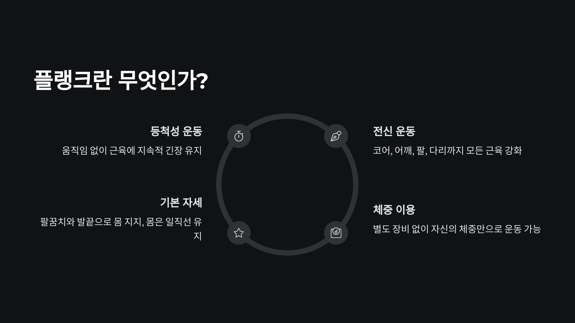플랭크(plank)는 맨몸 운동 중 하나로, 정적인 동작을 유지하면서 신체의 균형과 힘을 동시에 향상시키는 자세예요. 주로 팔꿈치와 발끝만을 바닥에 대고 몸을 일직선으로 유지하는 게 핵심이죠. 단순히 복근만 사용하는 운동이 아니라, 어깨, 등, 엉덩이, 다리까지 함께 사용하기 때문에 전신 운동에 가깝다고 볼 수 있어요.