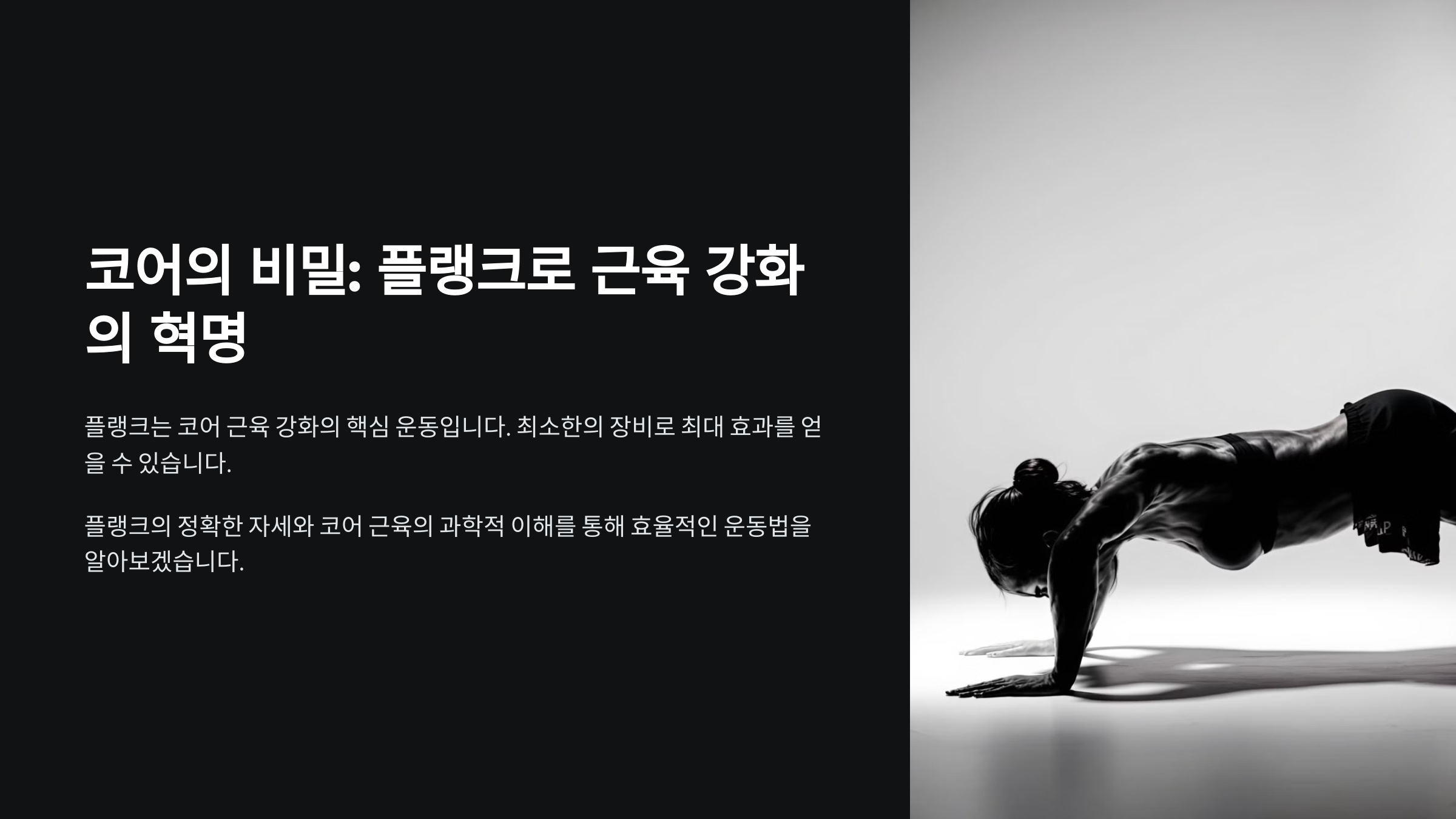 결론적으로 플랭크는 단순한 근지구력 향상을 넘어서, 전신 안정성과 자세를 교정해주는 과학적 효과가 검증된 운동이에요. 매일 1분씩만 투자해도 코어는 물론, 전신 건강에 큰 변화가 생길 수 있어요. 플랭크, 진짜 과학이에요!