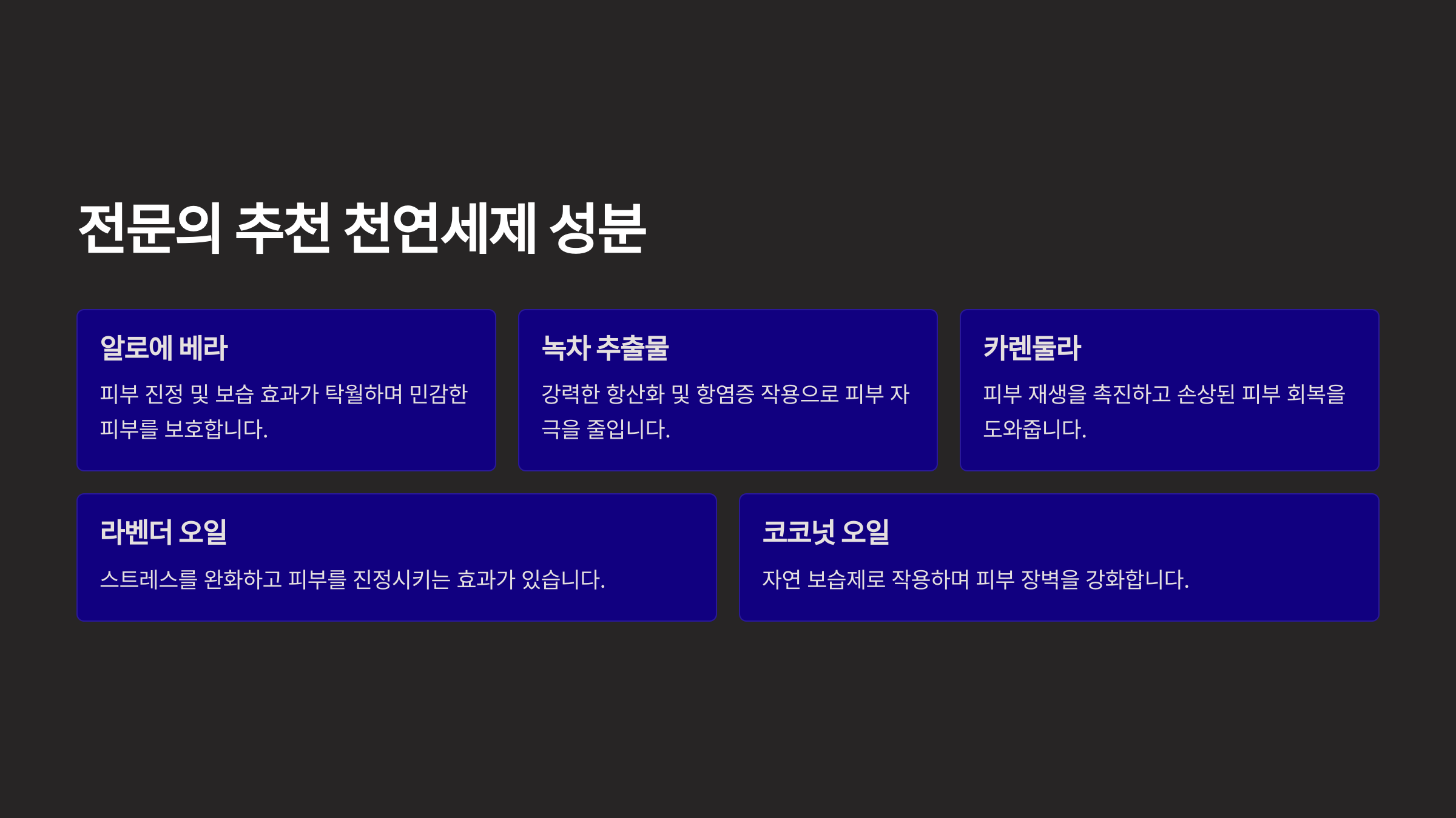 | 알로에 베라 | 진정, 항염 | 민감한 피부 진정 효과 |