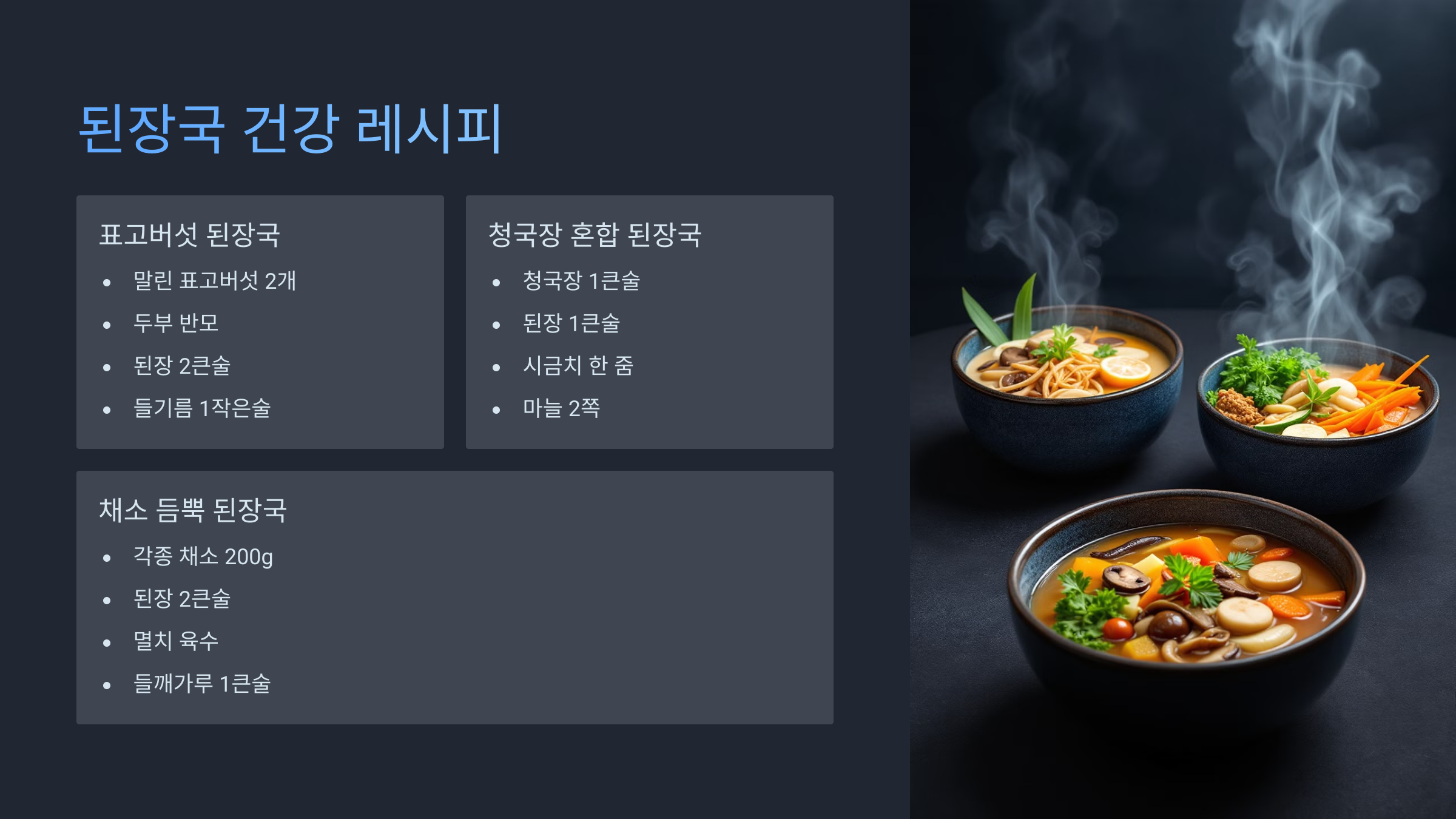 두 번째는 멸치, 다시마, 채소 육수를 활용해 천연 감칠맛을 높이는 방법이에요. 이렇게 하면 된장 사용량을 줄여도 맛은 깊어져요.