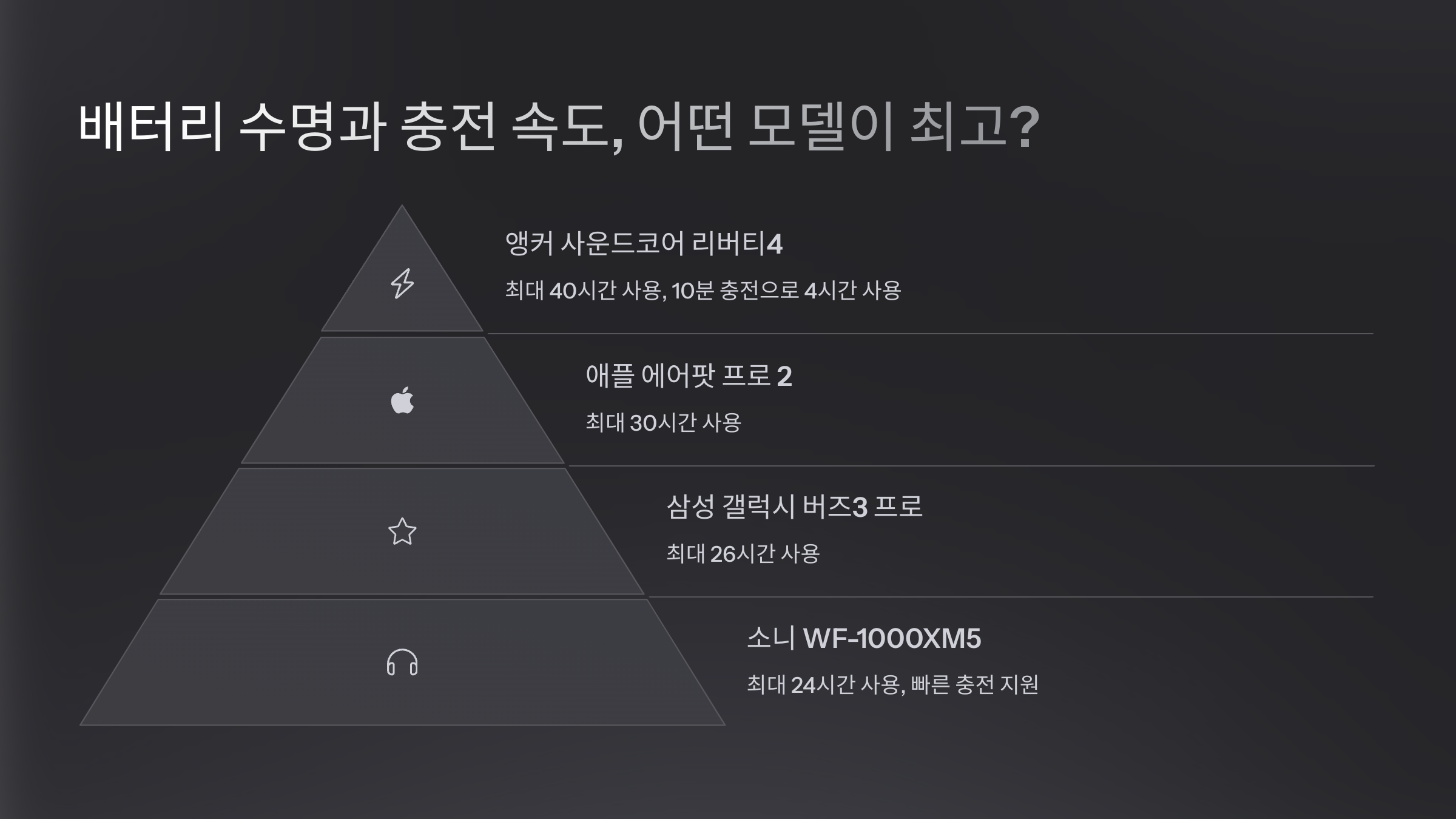 배터리 지속 시간이 가장 긴 모델은 애플 에어팟 프로 2세대예요. 반면, 연속 사용 시간은 소니 WF-1000XM5가 길어요. 충전 속도는 대부분 브랜드가 빠른 편이지만, 애플과 소니는 5분 충전으로 1시간 사용할 수 있는 강점을 갖고 있죠. 🏆