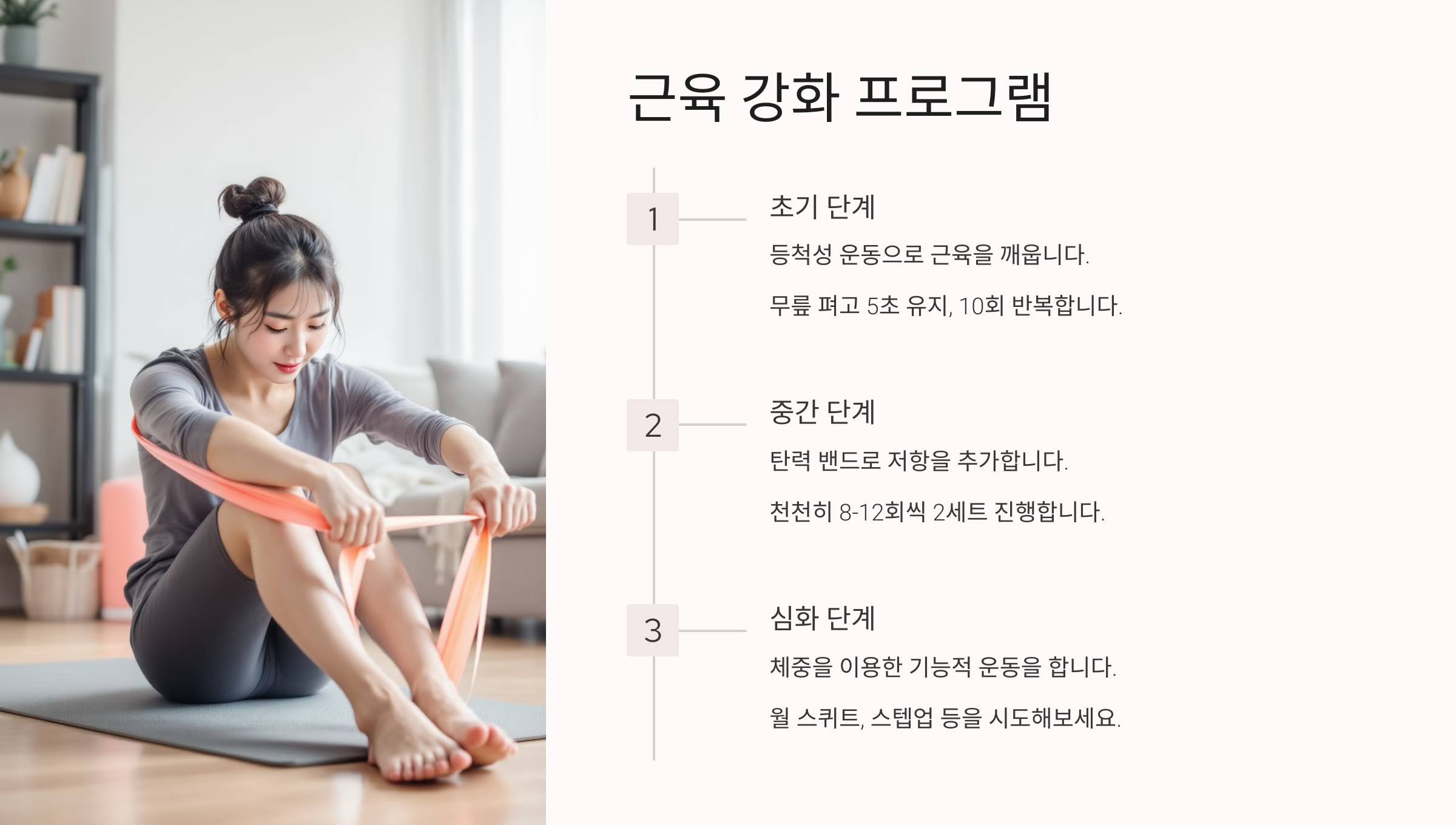 밴드를 활용한 '고무밴드 운동'도 재활에 효과적이에요. 부담 없이 점진적으로 근력을 늘릴 수 있어서 재활 단계에 특히 좋아요. 밴드를 다리에 걸고 바깥 방향으로 밀어내는 간단한 동작부터 시작해보세요.