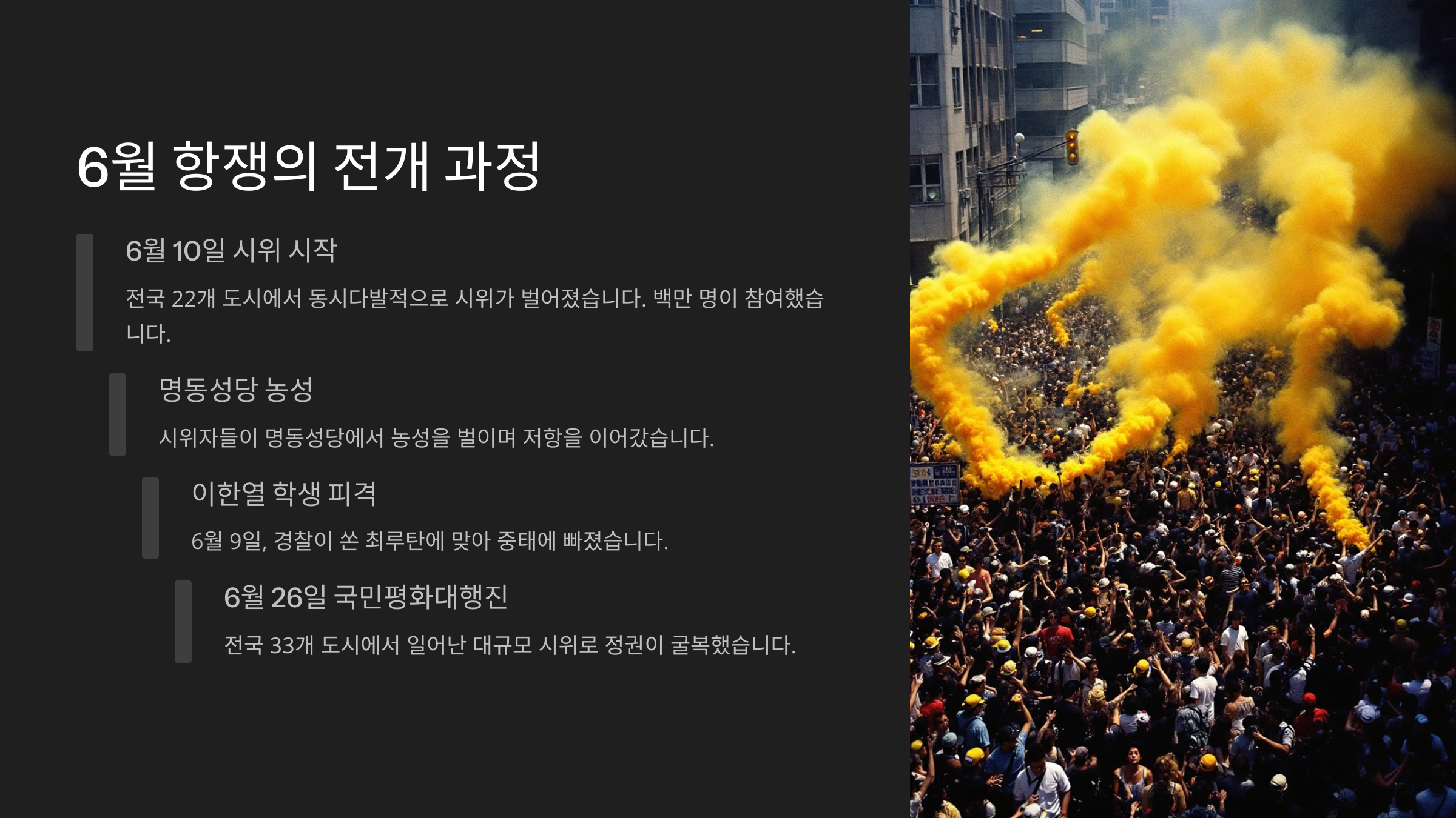 | 1987.06.10 | 6·10 국민대회 | 전국적 시위로 항쟁 본격화 |
