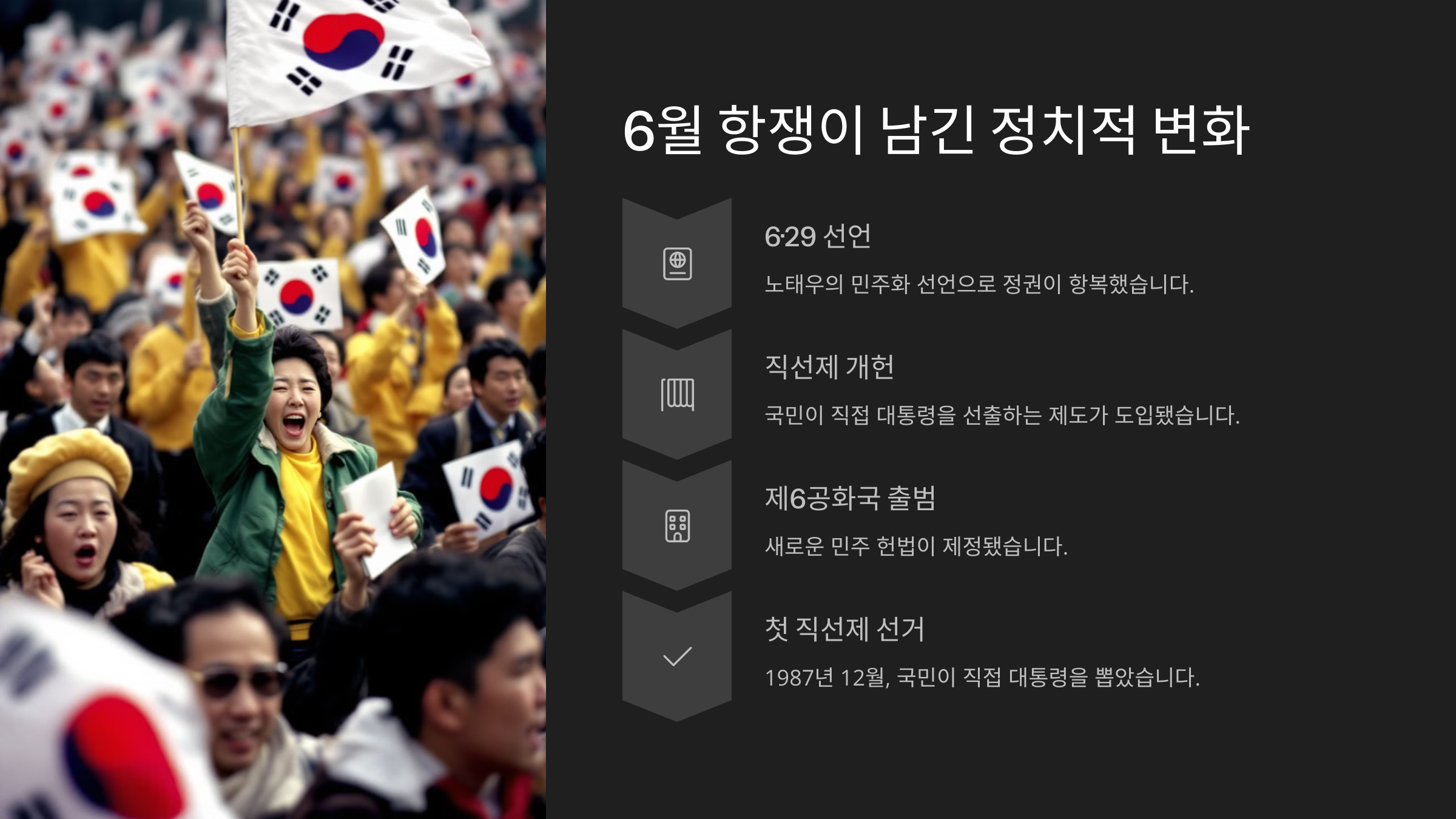 💬 그 결과로 대한민국은 권위주의 체제를 넘어서서, 민주주의로 가는 큰 문을 열 수 있었어요. 물론 이후에도 부족한 점은 있었지만, 6월 항쟁이 없었다면 지금 우리가 누리는 자유와 권리는 훨씬 더 늦게 찾아왔을지도 몰라요.
