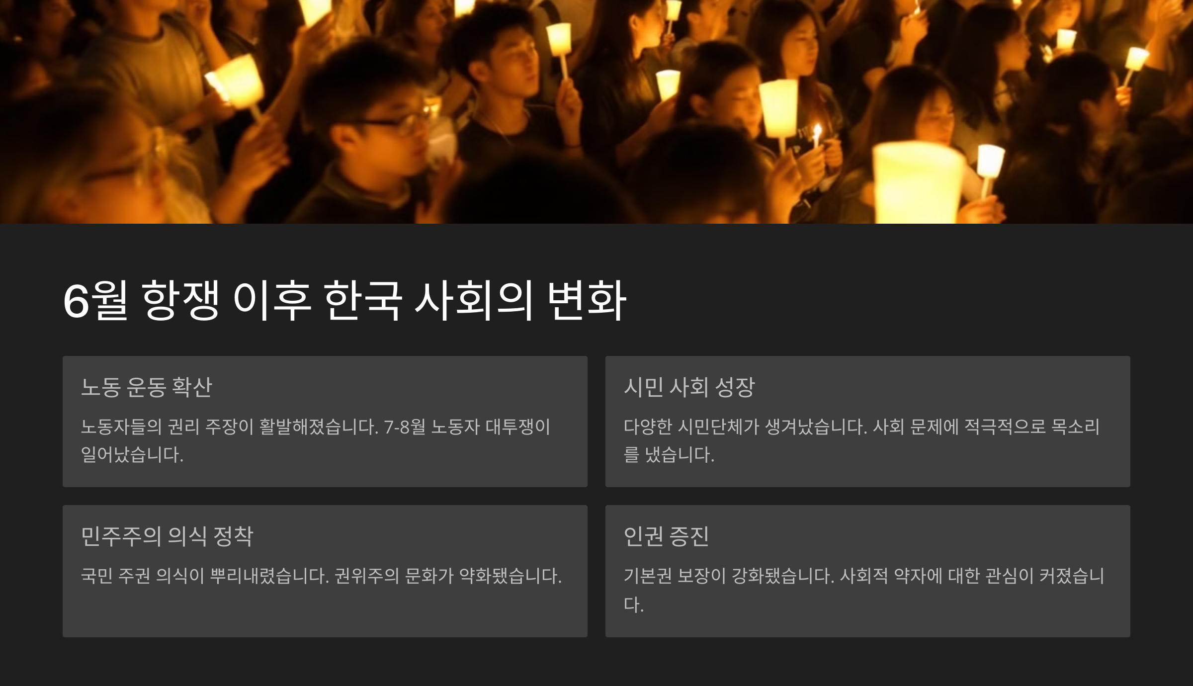 A7. 항쟁 이후 시민사회가 활성화되고, 언론 자유, 노동 운동, 인권운동이 본격화됐어요. 이후 정권 교체의 발판도 마련됐죠.